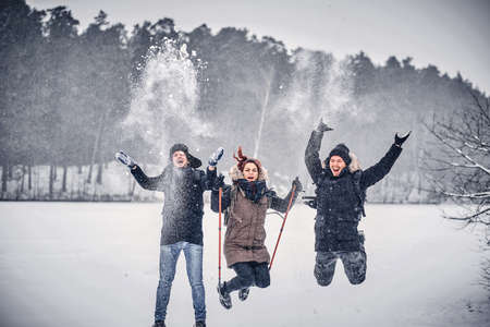 A group of joyful friends having fun together, hiking on a snowy forest