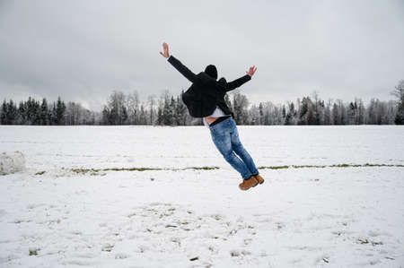 Young man jumping with joy outside in a snowy winter nature.