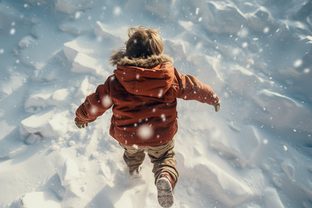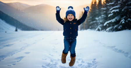 A little boy is playing in the deep snow in the evening