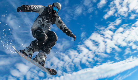 Stylish snowboarder with helmet and mask jumps from high snow slope