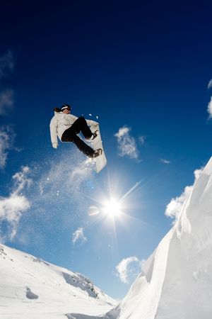 Flying snowboarder on mountains. Extreme winter sport.