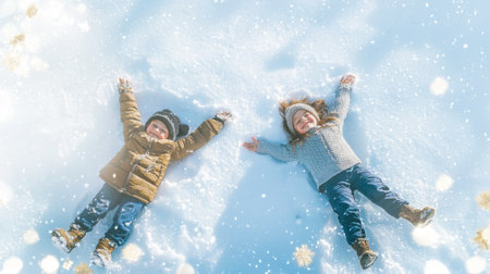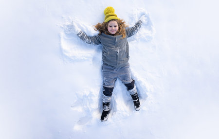 Child lying in snow making angel wings shape. Angel kid play in winter. Winter fun with a happy child making snow angels.