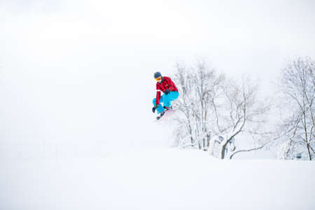 Freerider snowboarder doing speed trick air jump with his snowboard. Winter mountain freeride
