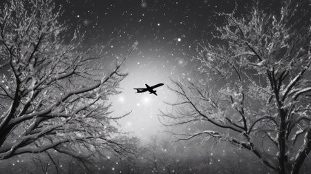 Winter cityscape. A flock of pigeons flies over a white snowy lake and trees in a city park in cloudy day. Motion blur. Monochrome