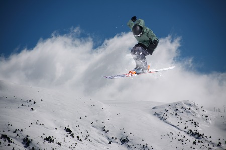 freeride skier performs jump in the air over a snow-covered mountain slope