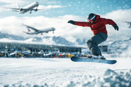 A snowboarder performs an impressive jump on snowy slopes near an airport while planes soar overhead.