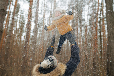 Dad lifting his happy little son up in the air during family stroll in forest