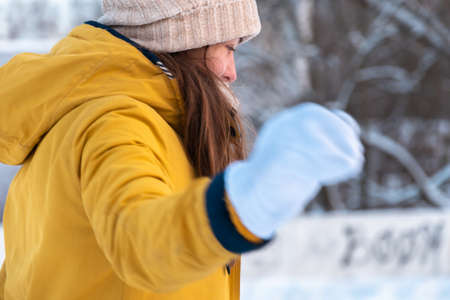 the woman making snowball in the winter park
