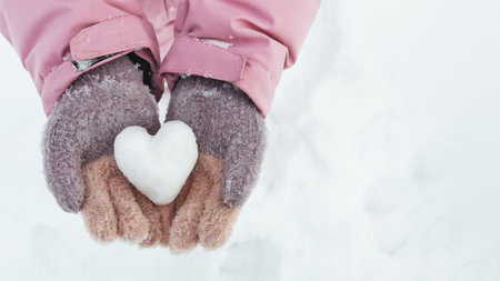 Close-up shot of hands in vibrant red knitted gloves delicately gathering white freshly fallen snow. Winter wonder and seasonal joy