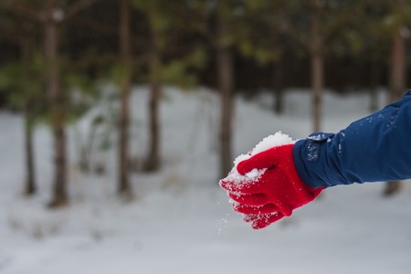 Close-up of hands in warm gloves playing with fresh snow on a sunny winter day. The background is blurred, showing a snowy forest.