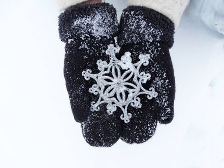 Snow-white snow on female hands. Black gloves with snowflakes. Christmas and New Year theme