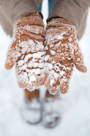 gloved hands in the snow in winter close