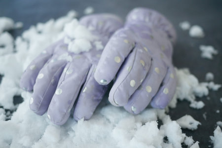 Purple gloves resting on a bed of artificial snow