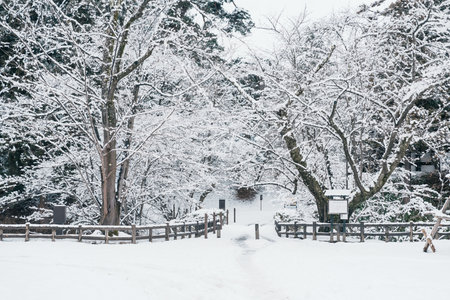 Heavy snow storm in park. Trees covered with deep, white and fluffy snow. Beautiful winter landscape scene outdoors. Concept of shoveling backyard. Winter wonderland after snow storm and hurricane