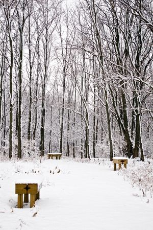 Snowy forest with wood benches