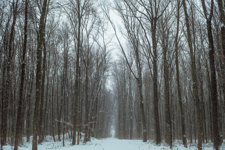 Winter path among trees in snowy forest. Natural winter forest landskape in evening sunlight. Rhytm of frosted trees trunks in winter season.