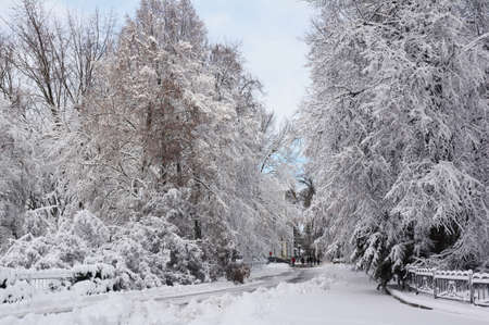 Winter in the city park. Snow alley