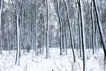 Wonderful beautiful winter forest landscape. Tall black trees against in the park. Wood hills covered with white snow. Uninhabited wilderness. Cold weather, season. Frosty day in December. Countryside