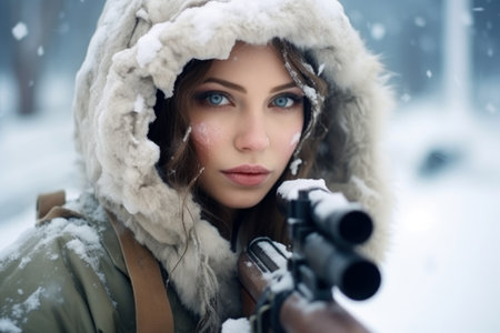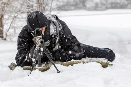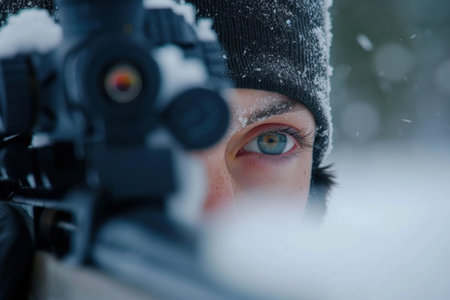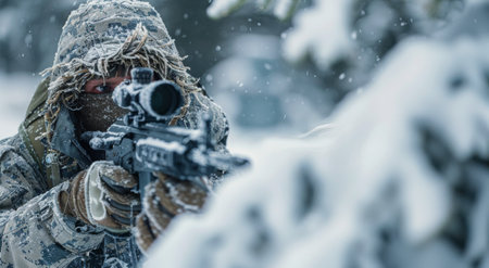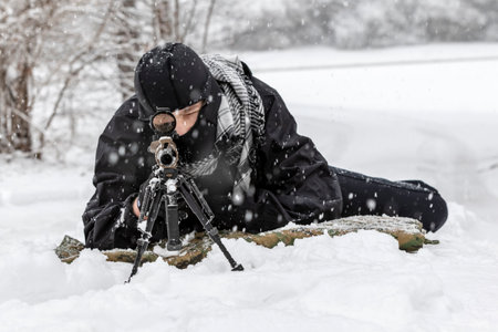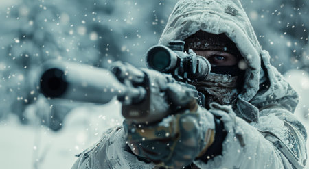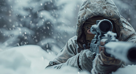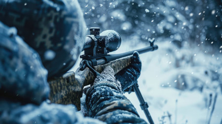 A skilled sniper, bundled in winter gear, holds a sniper rifle with an optical sight, aiming stealthily in a snowy landscape