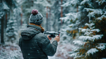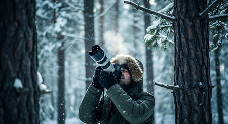 Photographer taking a picture of a snow covered pine forest on a cold winter day