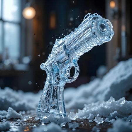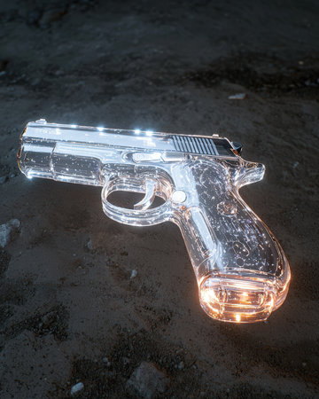Futuristic transparent pistol on a rough surface.