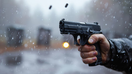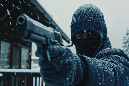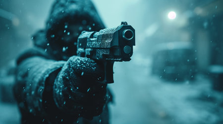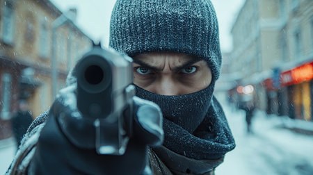 A man dressed in winter clothing, with his face partially covered, aims a handgun threateningly on a snow-covered street, amplifying the tension in the environment.
