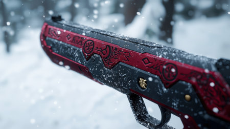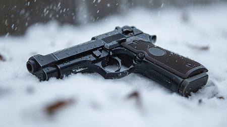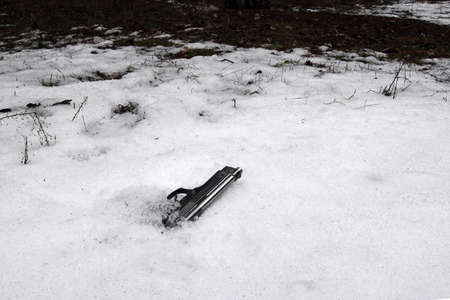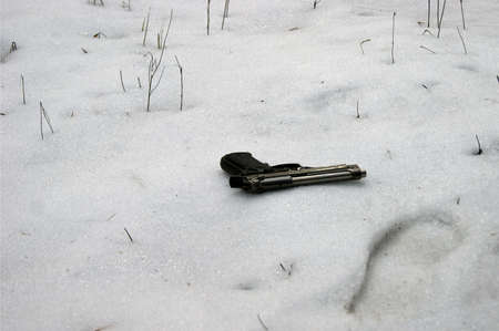 The intruder threw a gun in a snowy forest, in the hope that they would not be found. Murder weapon. Robbery. Crime.