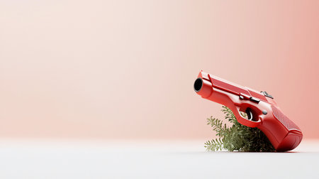 A vibrant red pistol rests on a bed of green foliage against a soft pink backdrop, creating a surreal and visually arresting composition. The minimalist setting enhances the contrast.