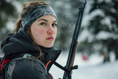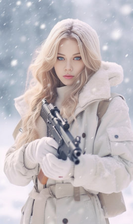 Winter adventure: woman with hunting gear in snowy forest