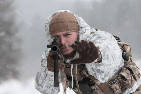 equipped army soldier Man in the winter khaki camouflage is patrolling or patrol field territory. commandos with full equipment helmet and gun watch battlefield. Modern army soldier