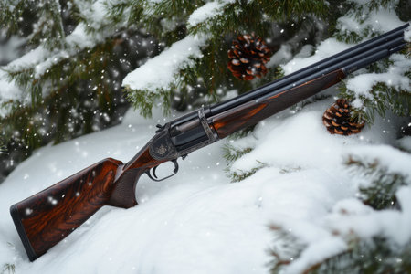 A vintage shotgun lies on a bed of snow surrounded by pine branches and cones creating a serene winter atmosphere.