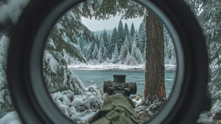 The image captures a perspective through a rifle scope, focusing on a snow-covered landscape. The scene features a river winding through a dense forest, with a monochrome palette. The composition presents a unique framing with the scope's circular shape. Suitable for editorial and commercial applications related to environment and nature.