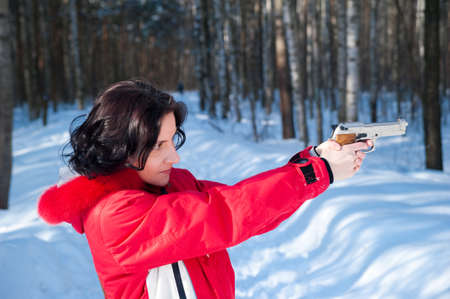 Beautiful girl with a machine gun in the winter forest. outdoor portrait