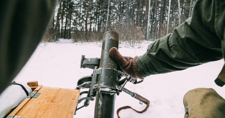Close-up View On Re-enactors Dressed As American Infantry Soldiers Prepare Fire From Mortar. Usa Army Soldiers Of World War Ii. Mortar Shooting Forest. Reconstruction Defense Battles. Heroes Of War