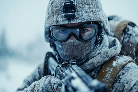 A soldier gripping a gun stands determinedly in the snowy landscape.
