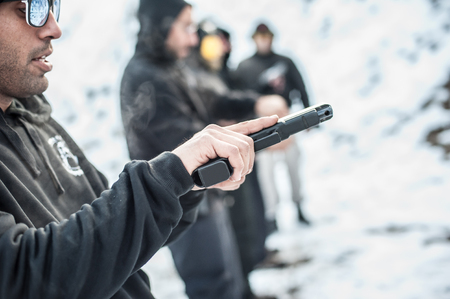 A gun in the hands of a young man, selective focus. Reloading weapons. Shooting training. Rules for keeping and carrying firearms. Background with copy space