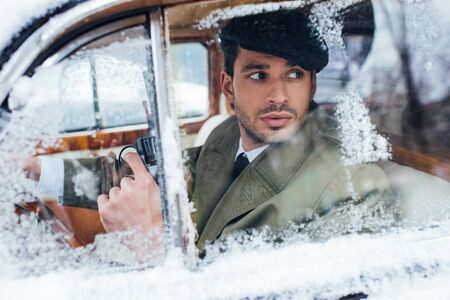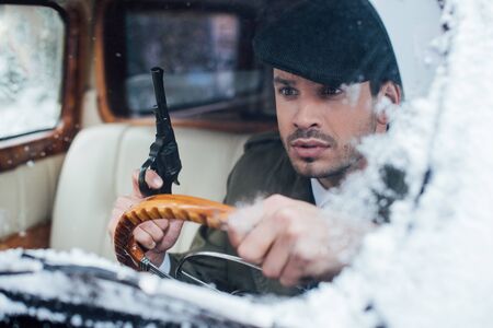 Selective focus of dangerous gangster with gun looking away in car