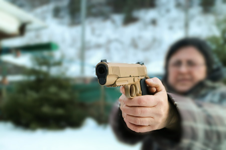 A violent male thug in action, the killer is aiming a gun. A man shoots a gun in the street.