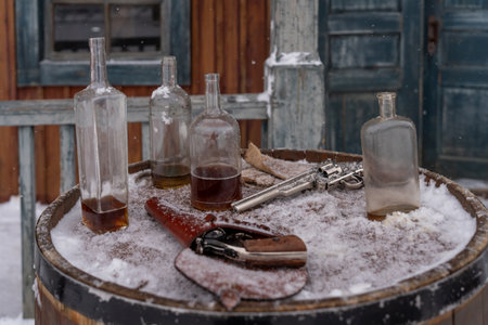 Abandoned Bottles and Revolvers on Snowy Barrel