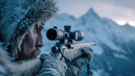 A focused hunter aims his rifle in a breathtaking snowy mountain landscape. The scene captures the essence of winter wilderness and adventure, bringing forth themes of survival and precision in a stunning frozen environment.