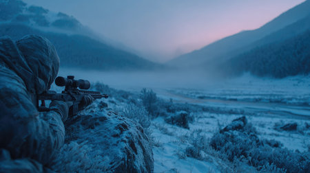 A skilled hunter lies in a frosty mountain landscape, rifle aimed patiently at dusk. The serene setting blends soft light with cold tranquility.