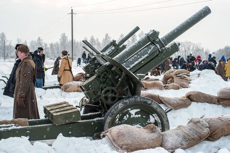 St. Petersburg, Russia - January 19, 2019: Military historical reconstruction - the battle for Leningrad. 122-mm Soviet howitzer model 1938. On the gun carriage there is a box with shells