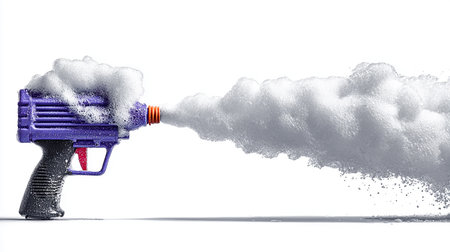 Black spray gun spraying a cloud of shimmering particles