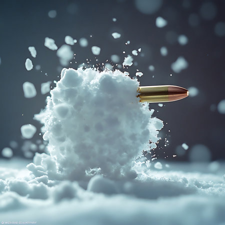 A captivating image depicting a bullet piercing soft snow, showcasing the dynamic motion and impact effects in a stunning winter setting with intricate details.
