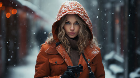 photo of adult Slavic woman as spy agent standing posing for picture at winter night, generative AI