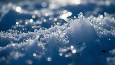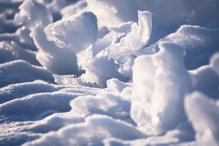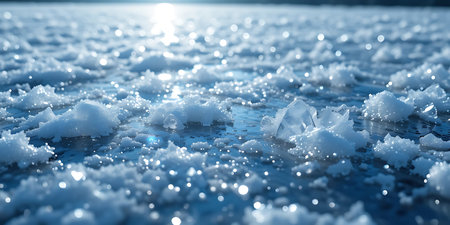 Close-up view of snow covering fractured ice, showcasing winter's serene beauty. Cold, peaceful scene.
