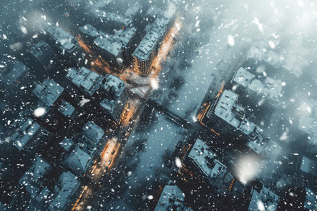 Snowy weather in a bustling city with frosted buildings and glowing lights.