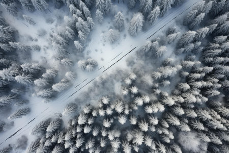 An aerial perspective captures a winding road meandering through a snowy forest. Frost-covered trees and a serene winter landscape evoke tranquility and beauty.
