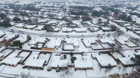 Parallel residential streets cover in heavy snow in Coppell, Texas, row of suburban houses large backyard in Dallas-Fort Worth metropolitan area impacts by severe weather, climate change, aerial. USA