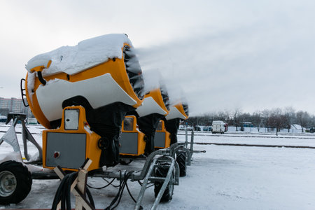 professional artificial snow machine cannon making snowflakes from water at ski resort